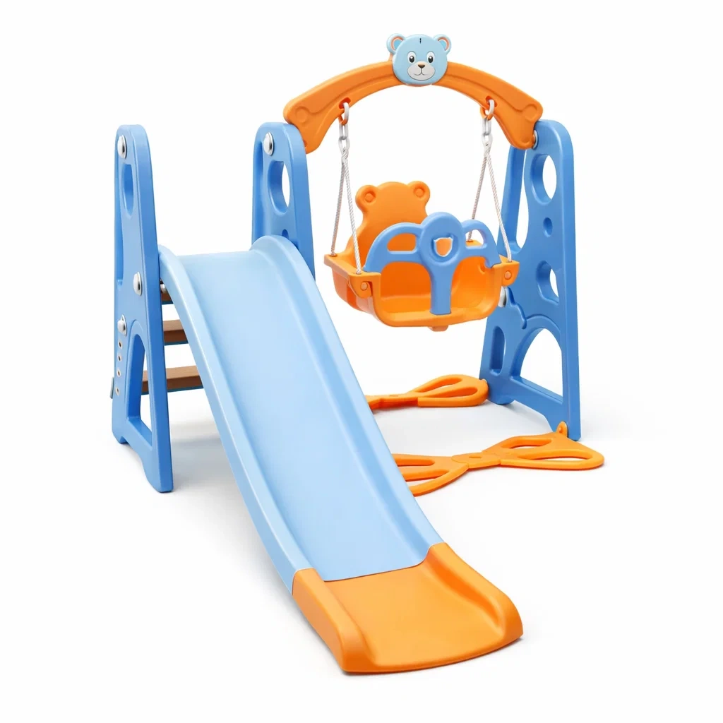 Structure de jeux pour enfants avec toboggan et balançoire en plastique motif ours
