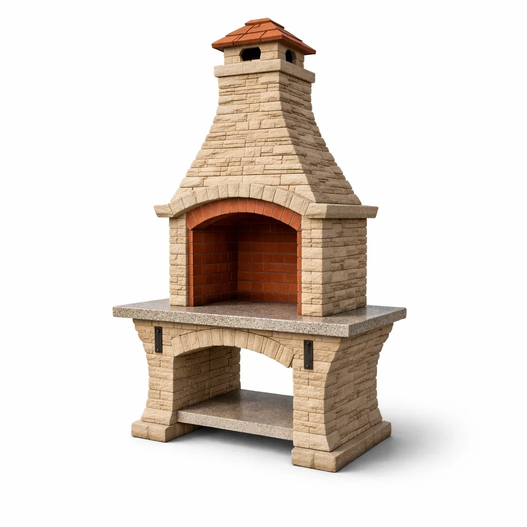 Ce barbecue est fabriqué en pierre réfractaire et en briques en terre cuite, avec des éléments en béton. Il mesure 115 cm de longueur, 65 cm de largeur et 210 cm de hauteur, pesant 350 kg.