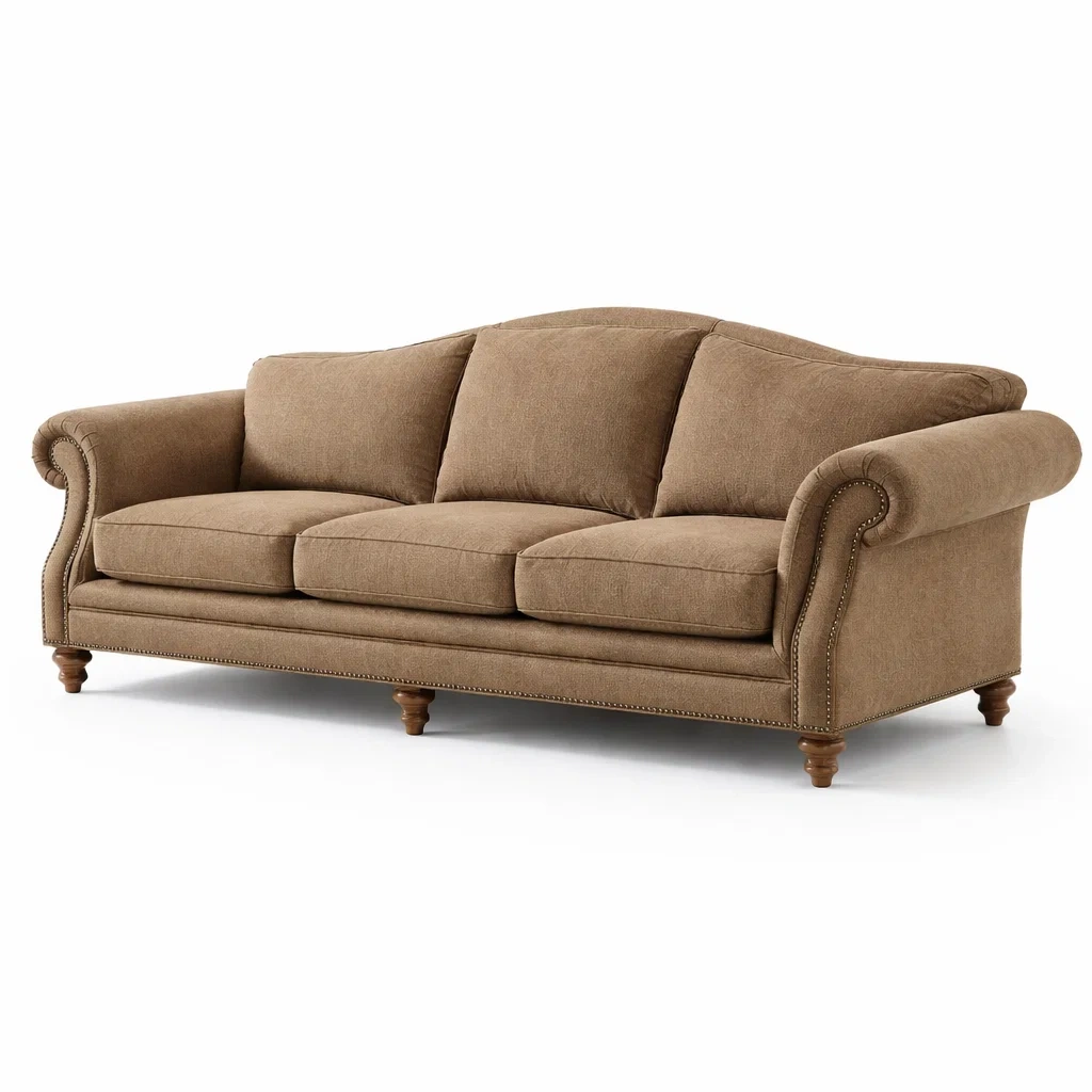 Ce canapé est conçu avec un revêtement en tissu de lin brun. Les pieds sont fabriqués en bois massif pour assurer la stabilité.