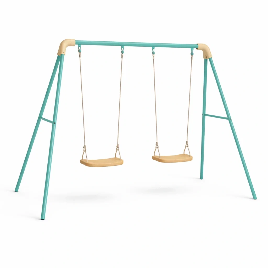 Cadre en acier peint, sièges en bois traité, cordes en polypropylène robustes.